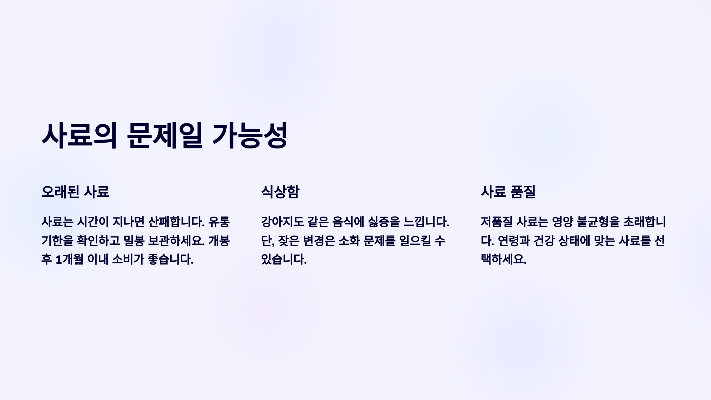 - ✔ 오래된 사료, 기름 냄새, 인공향료가 많이 나는 사료는 거부하기 쉬워요.