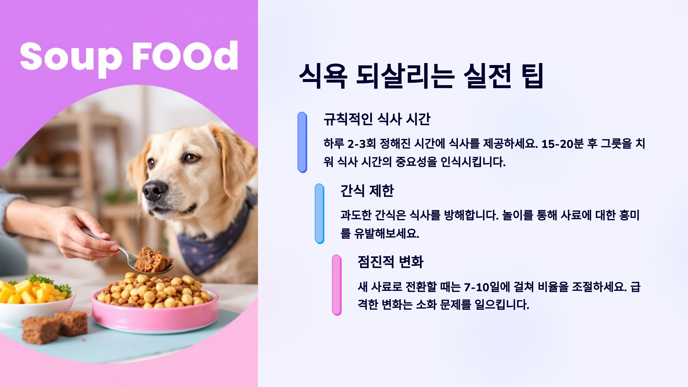 - 🥣 온도 조절, 간식 활용, 놀이 급여 등 식욕 자극 방법 다양