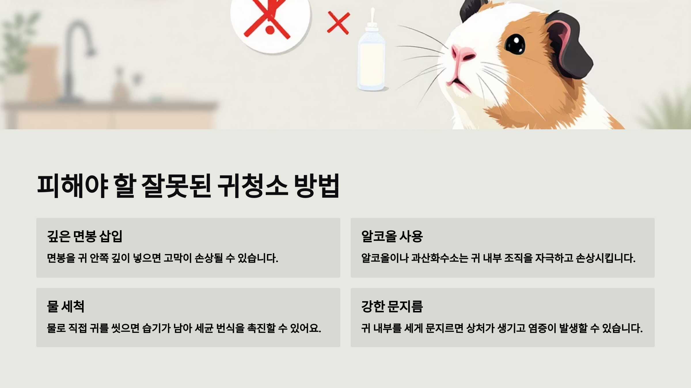 가장 흔한 실수는 면봉을 깊게 삽입하는 행동이에요. 기니피그의 귀는 작고 얇아서 조금만 깊이 들어가도 고막 근처까지 닿을 수 있어요. 귀 내부는 보이지 않기 때문에 무조건 표면만 닦는 것이 원칙이에요. ❌