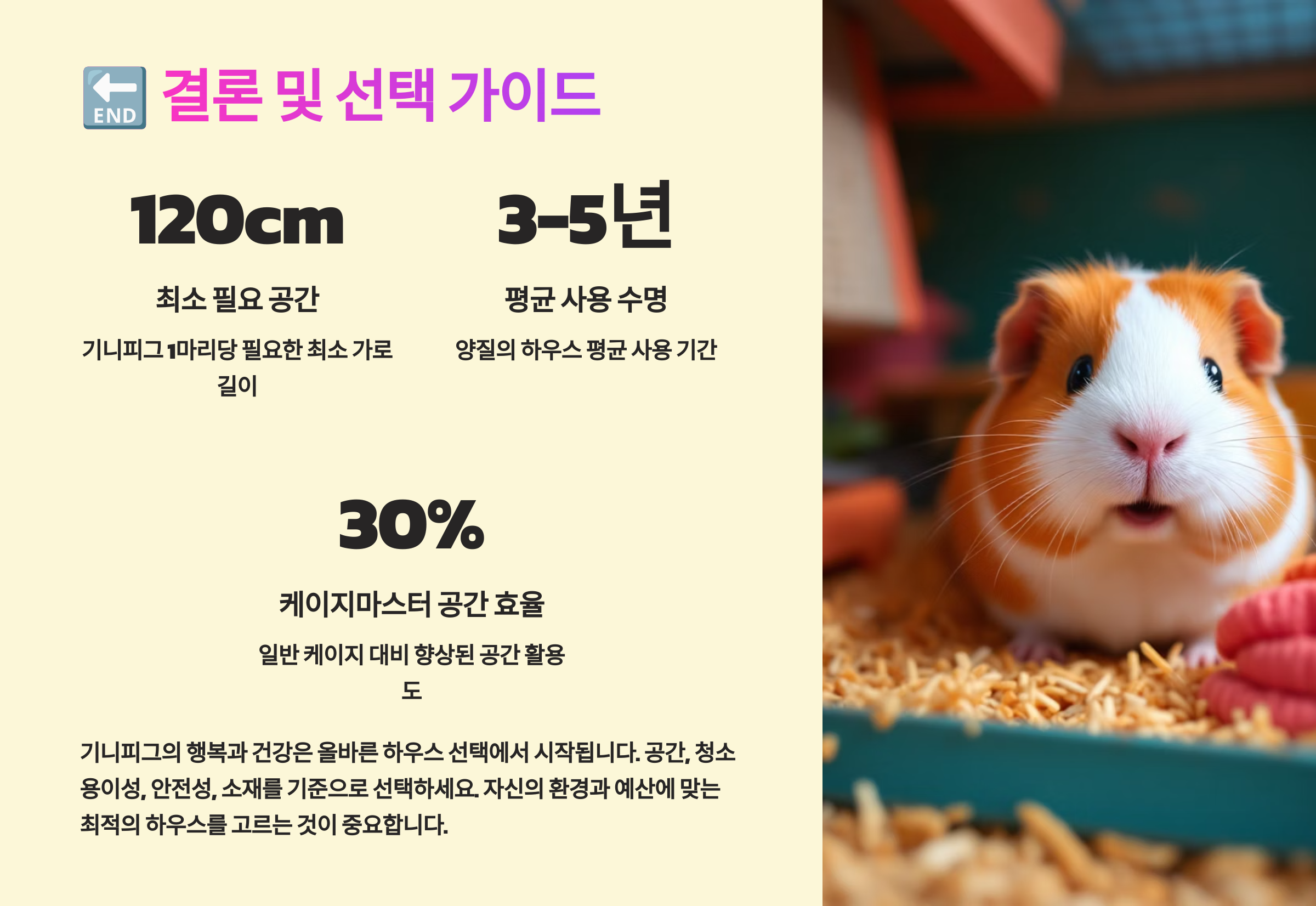 오늘 추천드린 브랜드와 조건들을 참고해서, 우리 아이만의 완벽한 작은 왕국을 만들어주세요. 기니피그의 반짝이는 눈빛과 행복한 소리로 매일매일 보답 받을 거예요 🐾✨