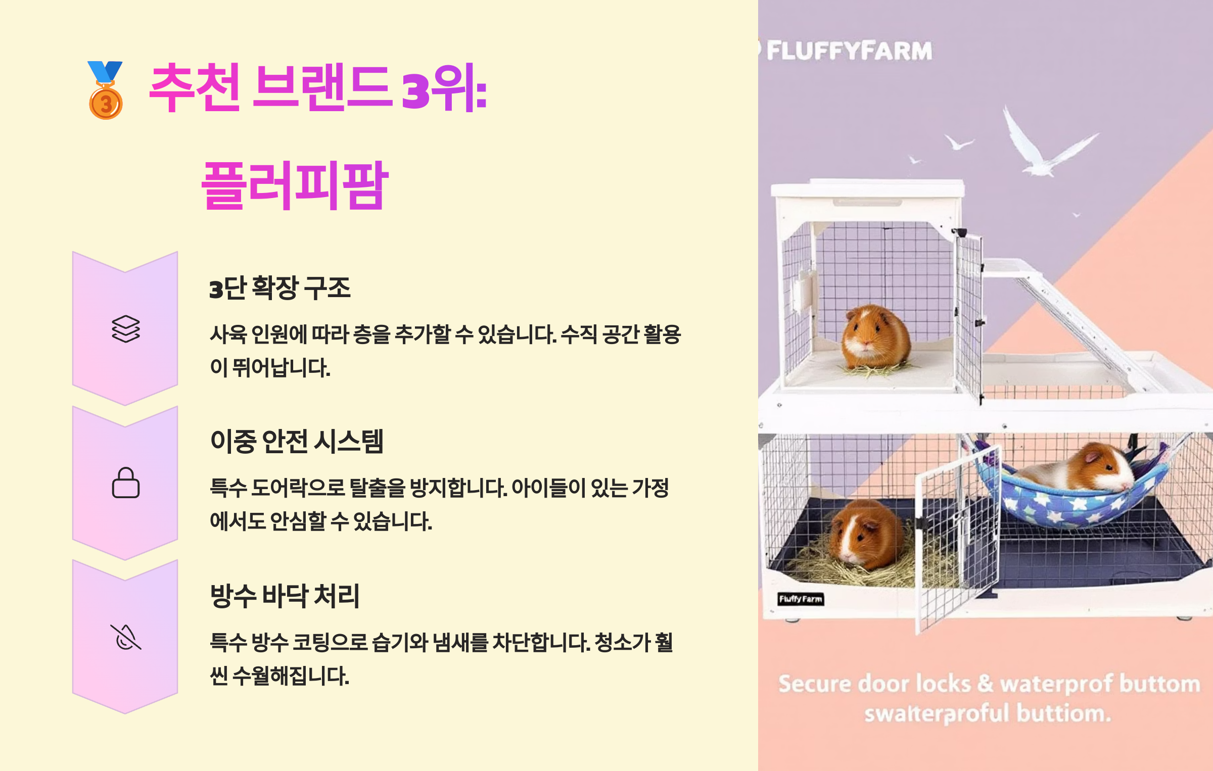 🥉 플러피팜은 기니피그의 본능을 살린 자연 친화적 디자인으로 유명해요. 넓은 공간감과 아늑한 분위기를 제공하면서, 가격대도 매우 합리적인 브랜드랍니다 🌿