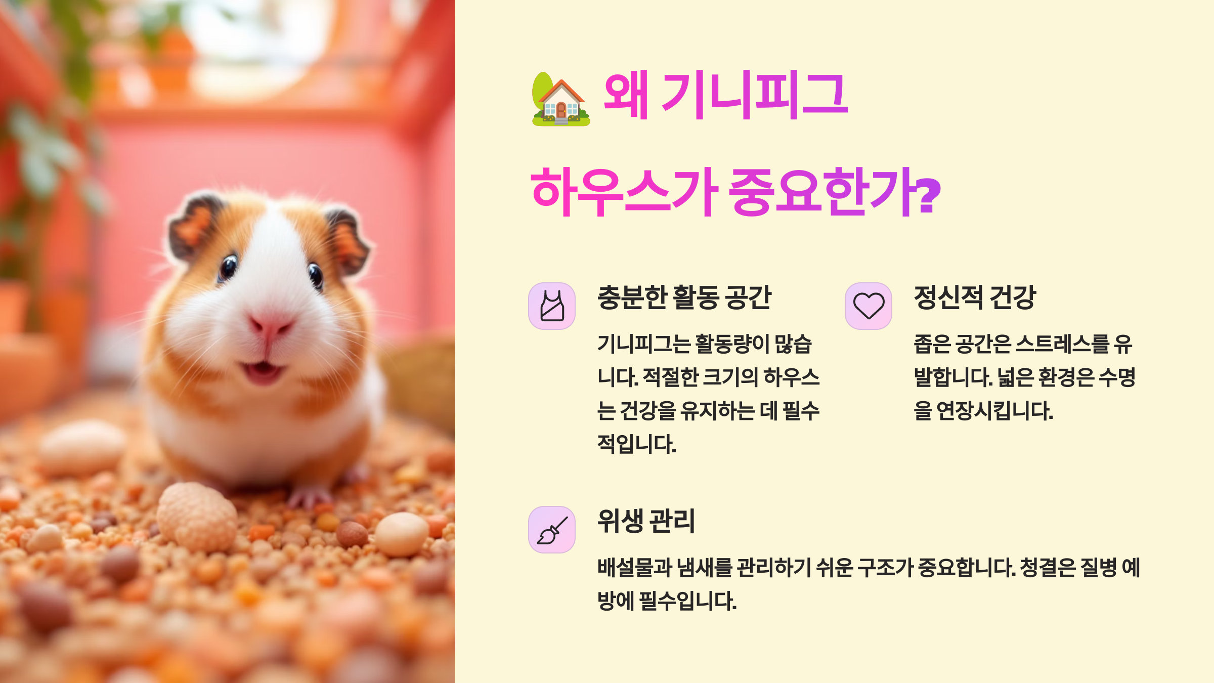 내가 생각했을 때, 좋은 하우스를 고른다는 건 곧 기니피그와 오래오래 건강하고 행복한 시간을 보내겠다는 약속이라고 느껴요. 공간을 잘 준비해주면, 우리 아이들의 눈빛부터 달라지는 걸 직접 느끼게 될 거예요 🐹💖