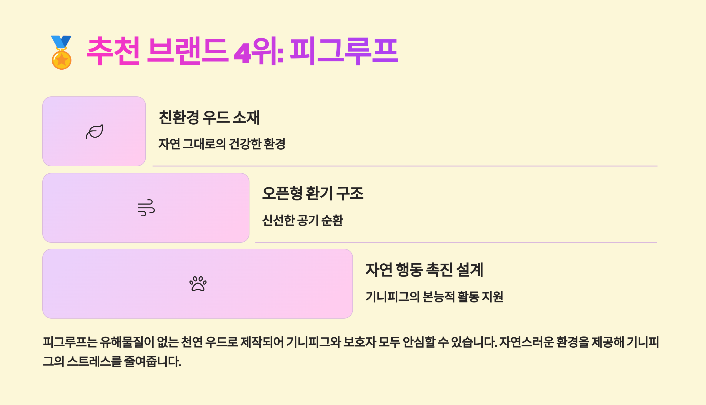🥉 플러피팜은 기니피그의 본능을 살린 자연 친화적 디자인으로 유명해요. 넓은 공간감과 아늑한 분위기를 제공하면서, 가격대도 매우 합리적인 브랜드랍니다 🌿