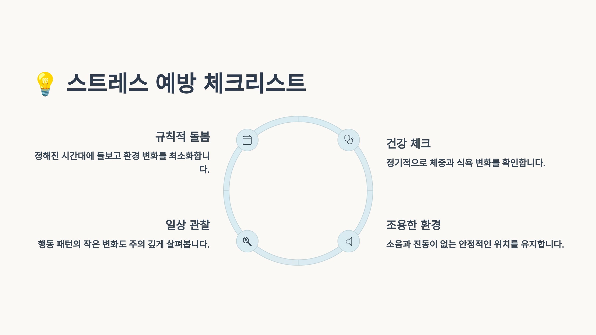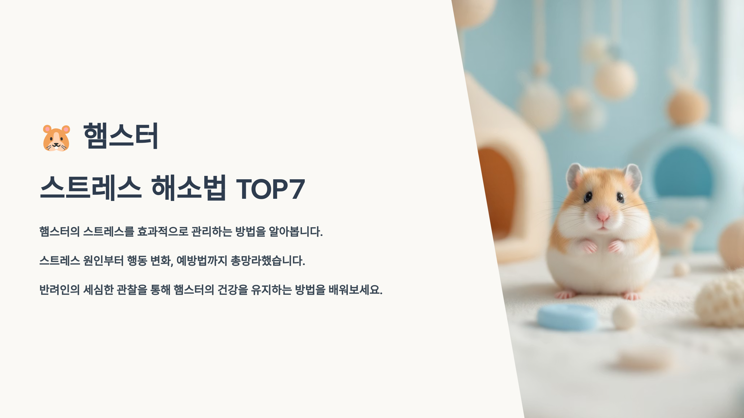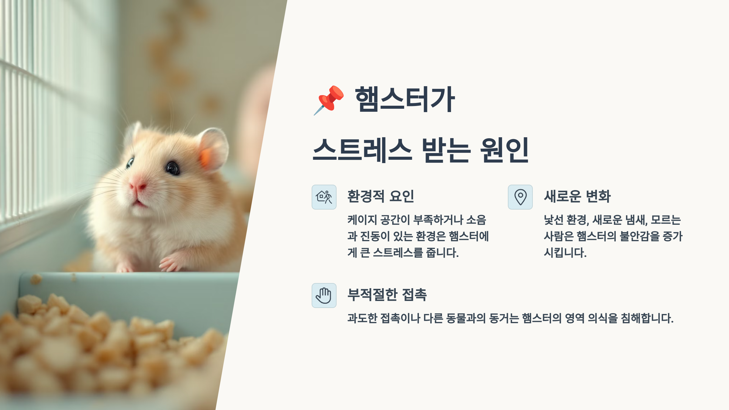 햄스터는 작고 조용한 반려동물이지만, 그만큼 스트레스에 매우 민감한 동물이기도 해요. 소리, 냄새, 공간, 심지어는 손의 접근까지도 스트레스 요인이 될 수 있답니다. 하지만 보호자가 조금만 신경 써주면 그 작은 마음을 편안하게 해줄 수 있어요. 🧘♂️🐹
