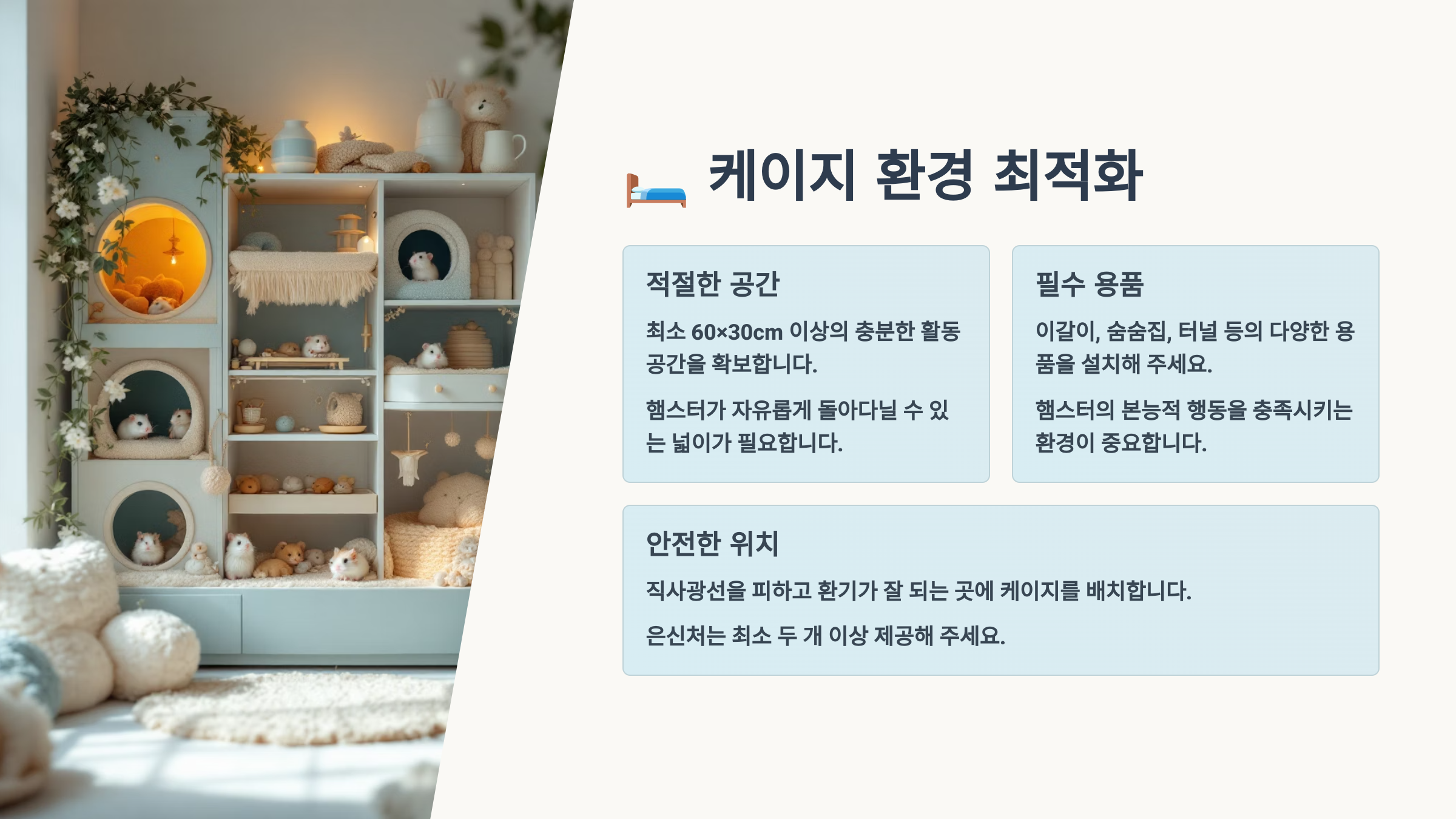 햄스터는 자신의 공간에서 안전함을 느낄 때 비로소 스트레스를 내려놓고 활발한 생활을 할 수 있어요. 하지만 시중 케이지는 작고 단조로운 경우가 많아서 환경 최적화는 보호자의 손에 달려 있어요! 🧰🐾