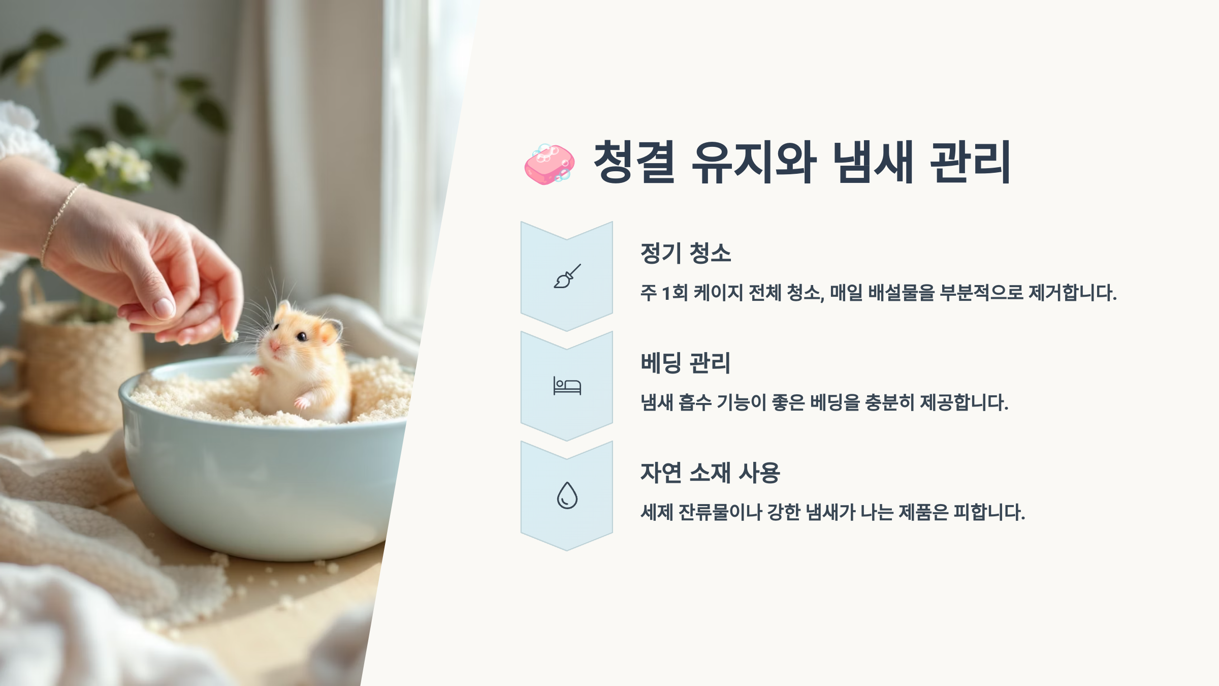 햄스터는 자신의 영역에 냄새를 남기는 습성이 있어요. 그런데 이 냄새가 너무 강하거나 공간이 더러워지면 본인조차 스트레스를 받는 역설적인 상황이 발생해요. 청결은 햄찌와 보호자 모두에게 꼭 필요한 요소예요. 🧴🐾