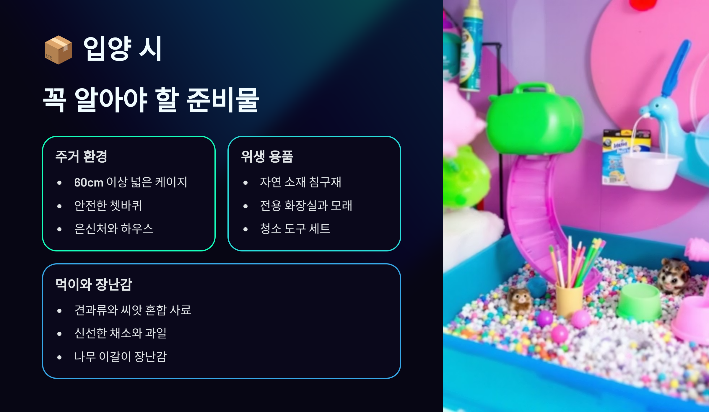 이제 📦 입양 시 꼭 알아야 할 준비물로 넘어가서, 햄스터를 집으로 들이기 전에 무엇을 준비해야 할지 알려드릴게요!