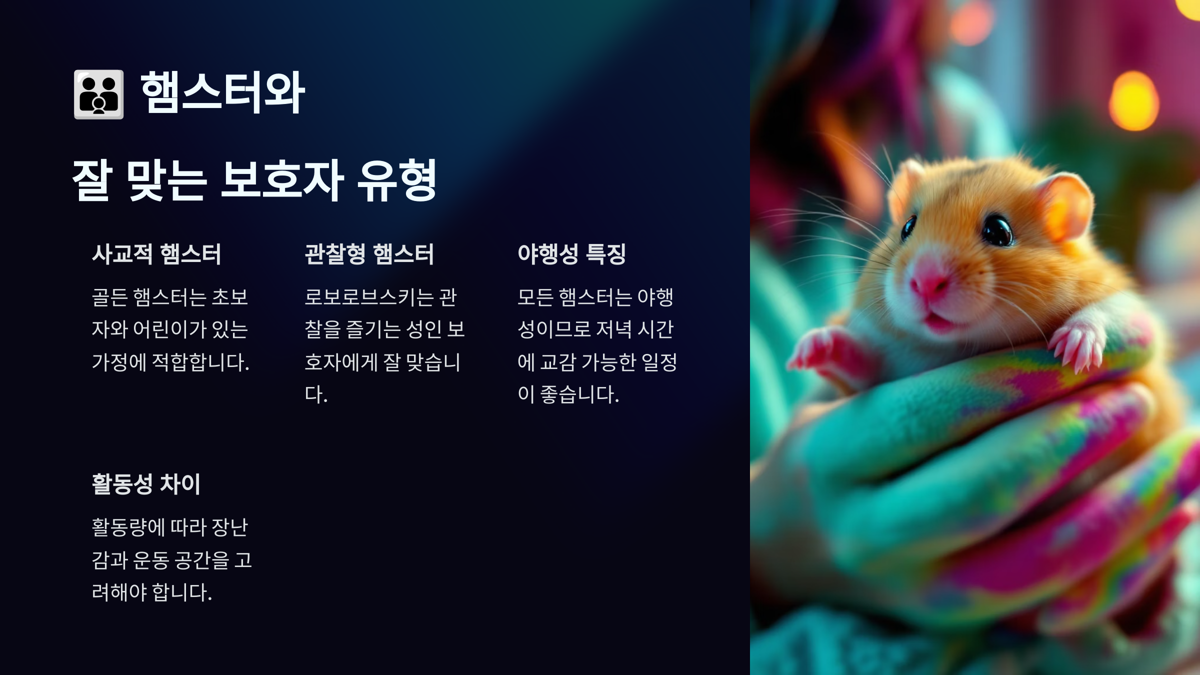 예를 들어 골든 햄스터는 조용하고 단독 생활을 좋아해 혼자 있는 시간이 많은 보호자에게 어울리고, 정글리안이나 로보로브스키는 활동량이 많아 자주 관찰하거나 놀아줄 수 있는 보호자에게 더 잘 맞아요.