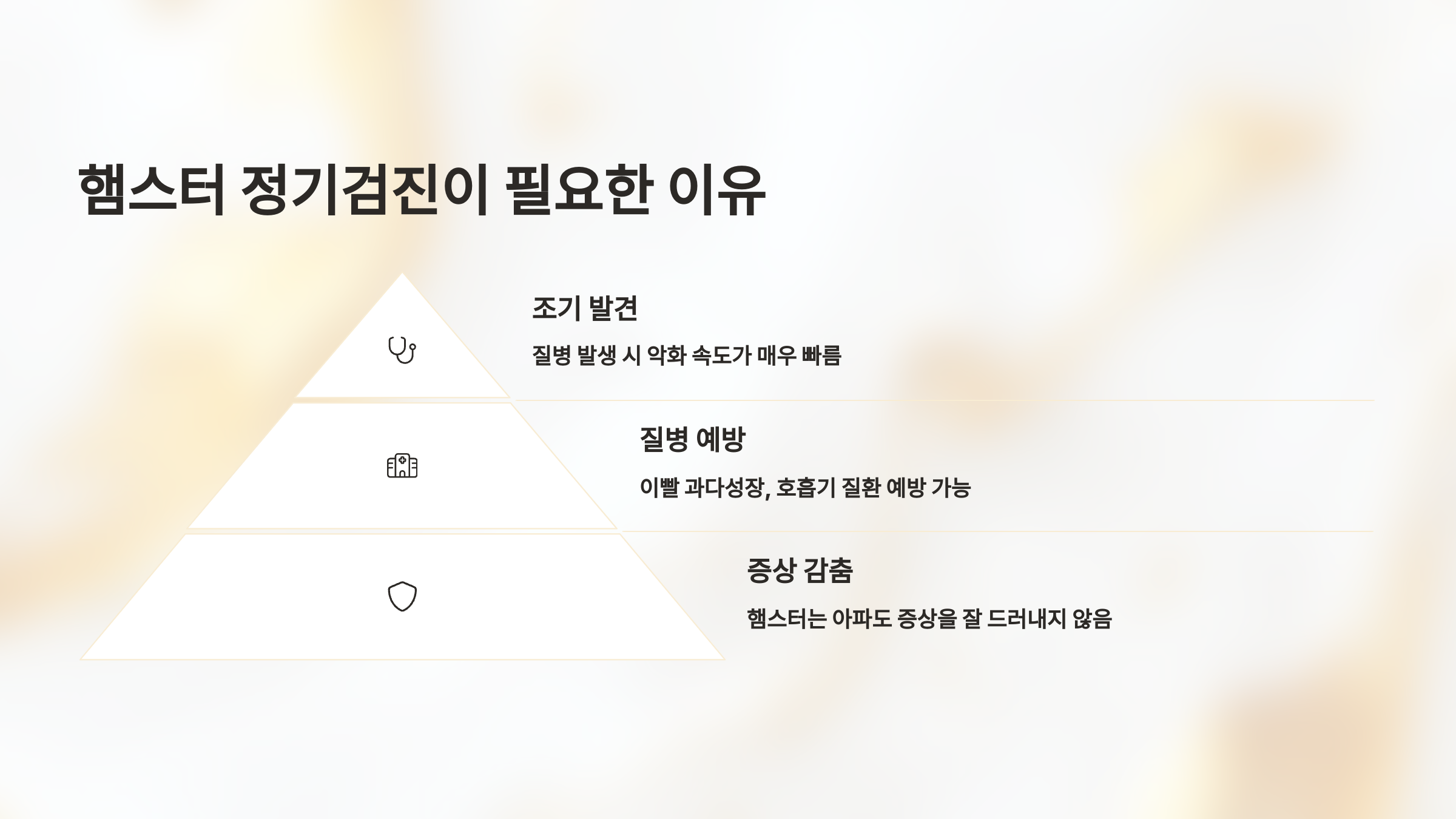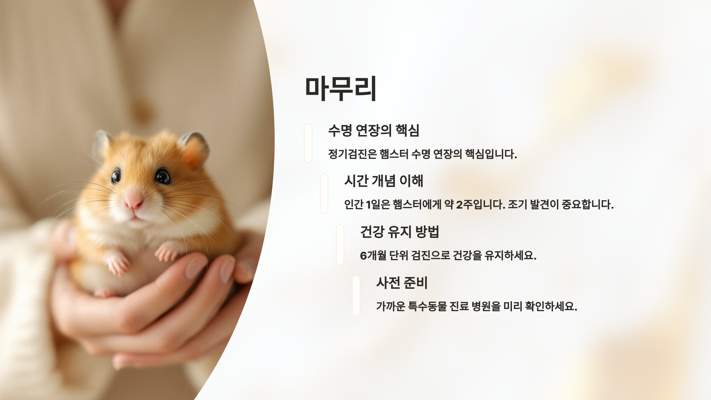 2025년 지금, 햄스터 정기검진은 선택이 아니라 반려의 책임이에요. 우리 햄찌의 평생 건강을 위해 오늘부터 실천해볼까요? 🧡🐾