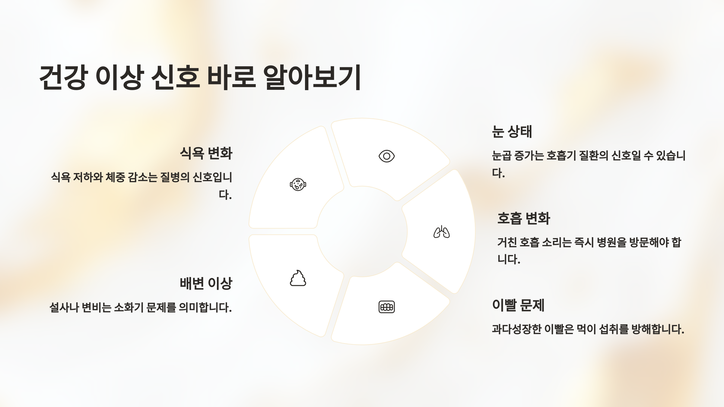 - 몸무게 변화나 움직임 감소가 질병 신호일 수 있음