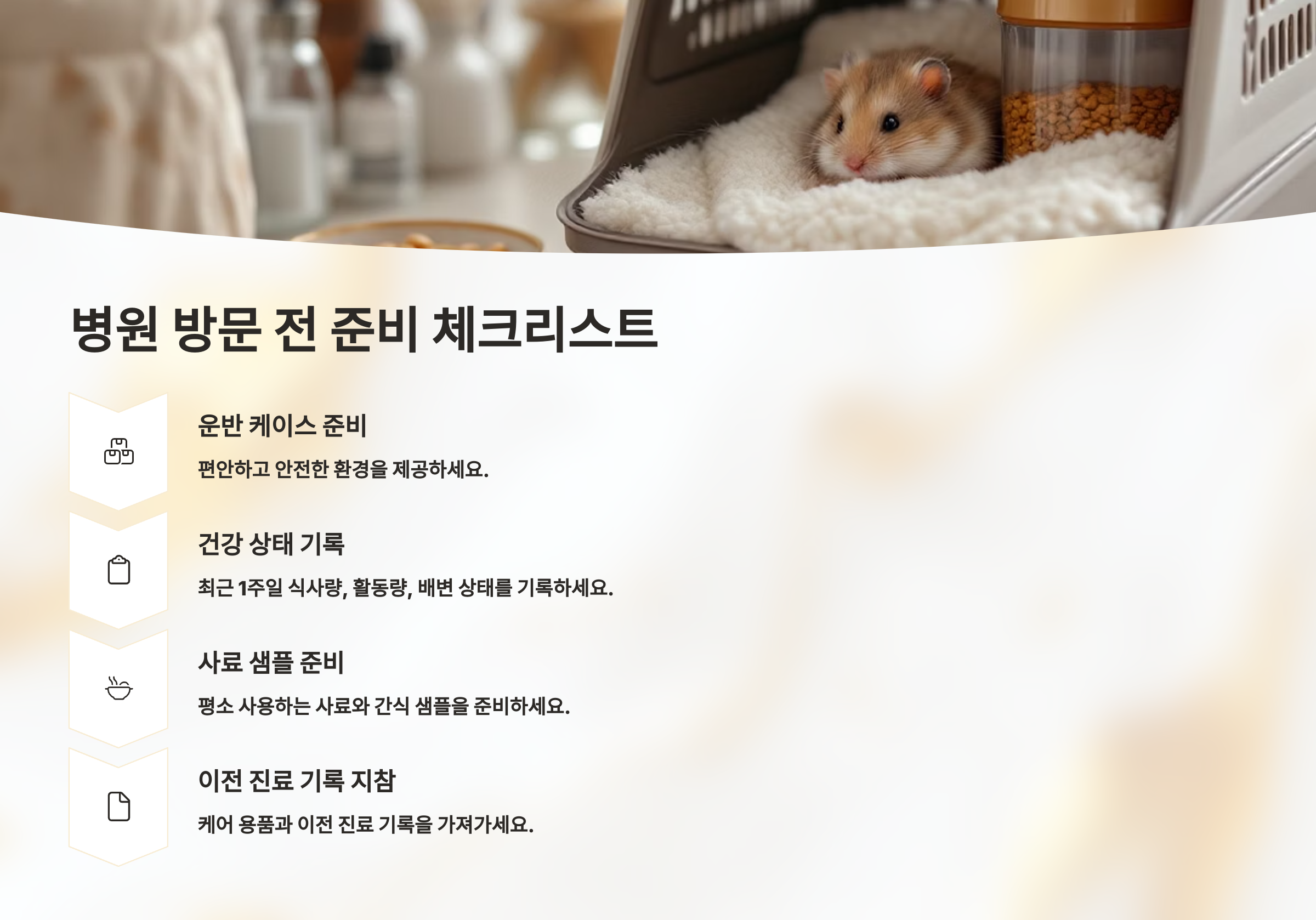 준비가 잘 돼 있으면 햄찌도 덜 불안해하고 수의사 선생님도 진단이 훨씬 쉬워져요! 진료는 단순히 병원 가는 게 아니라, 보호자의 관심이 시작점이에요. 🧡🐹