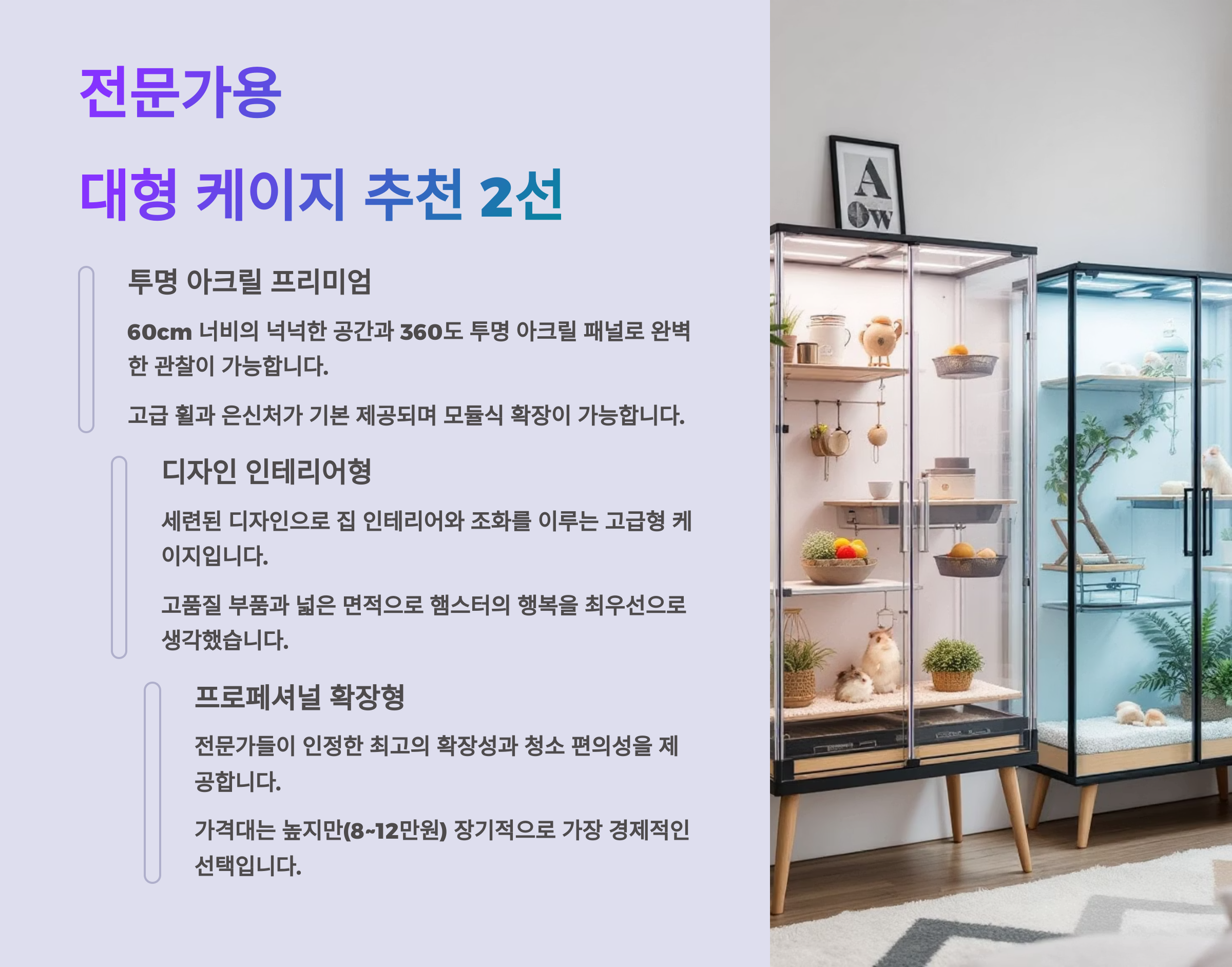 이제 전문가급 대형 케이지로 넘어가볼게요! 다음 섹션에서는 프리미엄 케이지 2가지를 소개할게요. 대형 골든햄스터나 번식 목적 사용자에게 추천해요! 🏰🐹