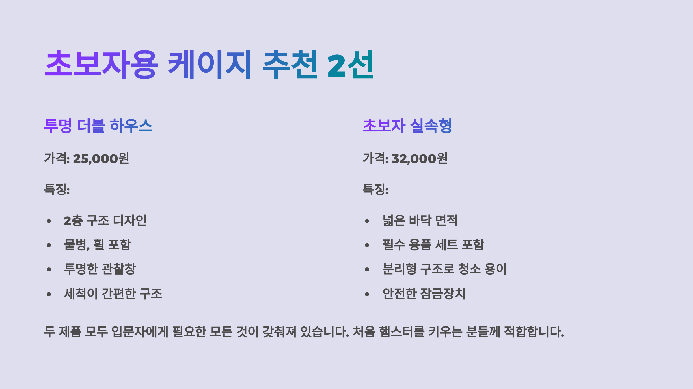 이제 각 기준에 맞는 실제 제품 추천으로 들어가볼게요! 다음 섹션에서는 초보자에게 딱 좋은 케이지 2가지를 소개해드릴게요! 🐹✨