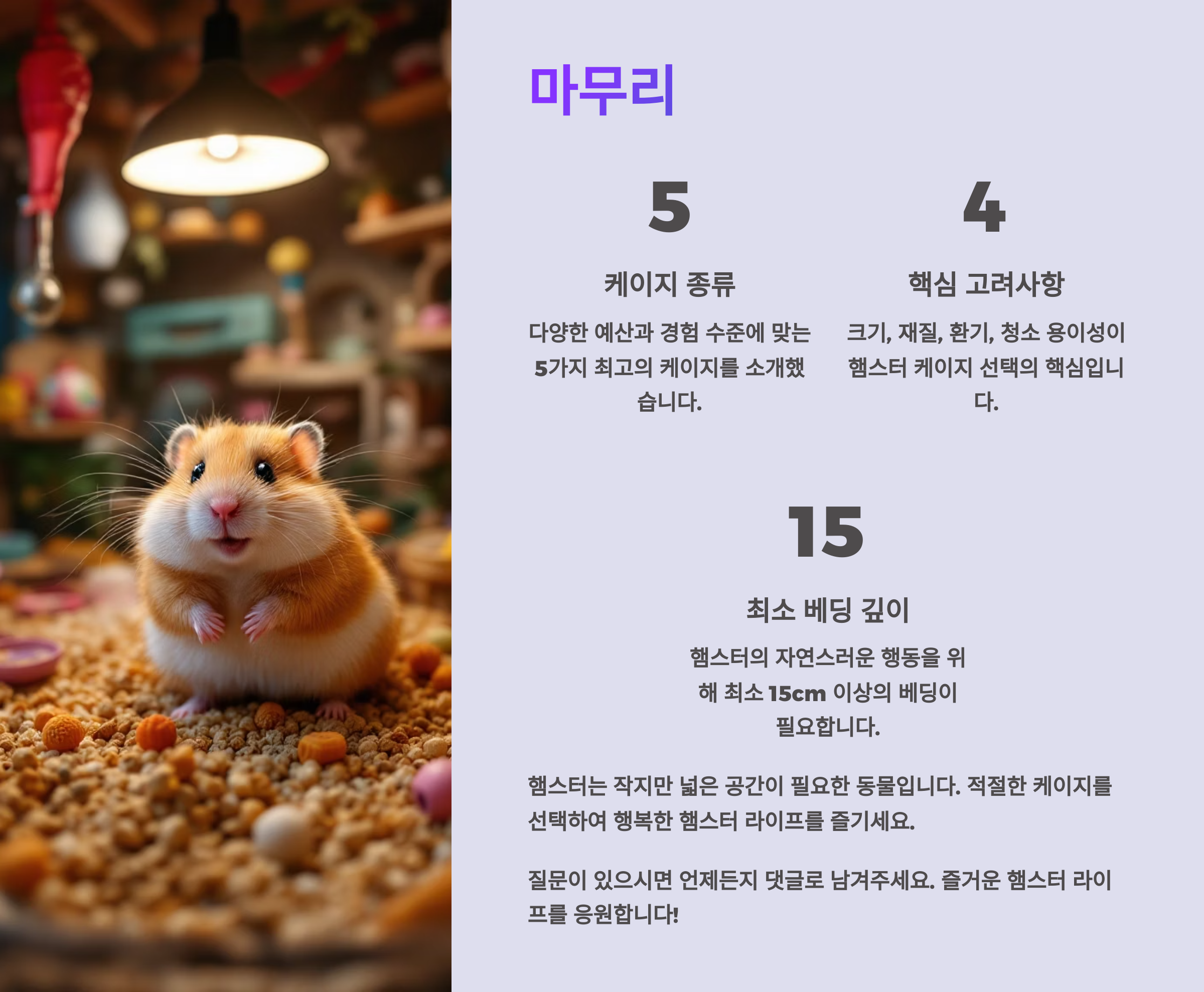 앞으로 케이지를 고를 땐 이번 글에서 정리한 기준들을 꼭 한번 다시 떠올려보세요. 햄스터에게 집은 단순한 케이지가 아니라 세상 전체니까요. 🏡🌍