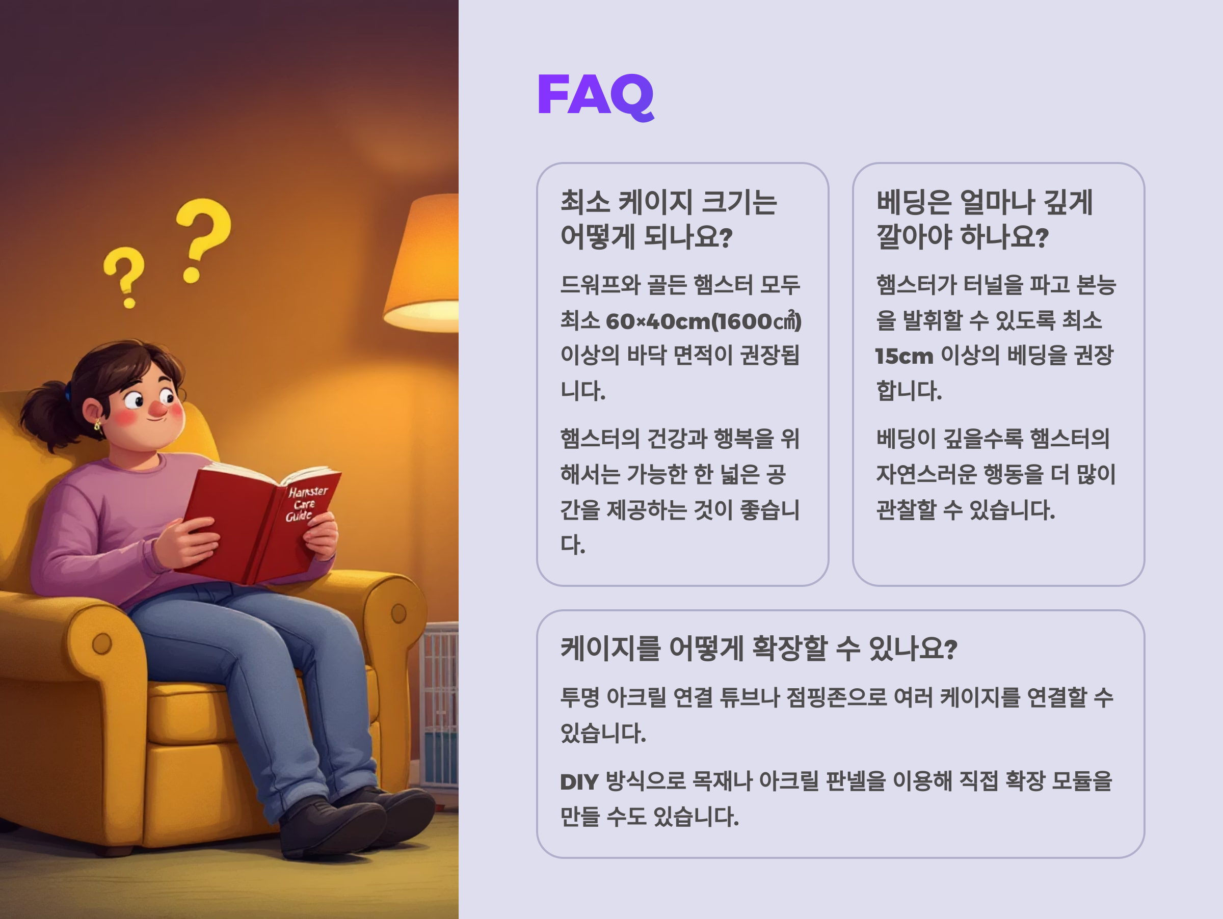 이제 궁금한 것만 쏙쏙 정리한 햄스터 케이지 관련 FAQ를 소개할게요! 실제 구매자들이 자주 물어보는 핵심 질문 8가지를 정리했어요! ❓🐾