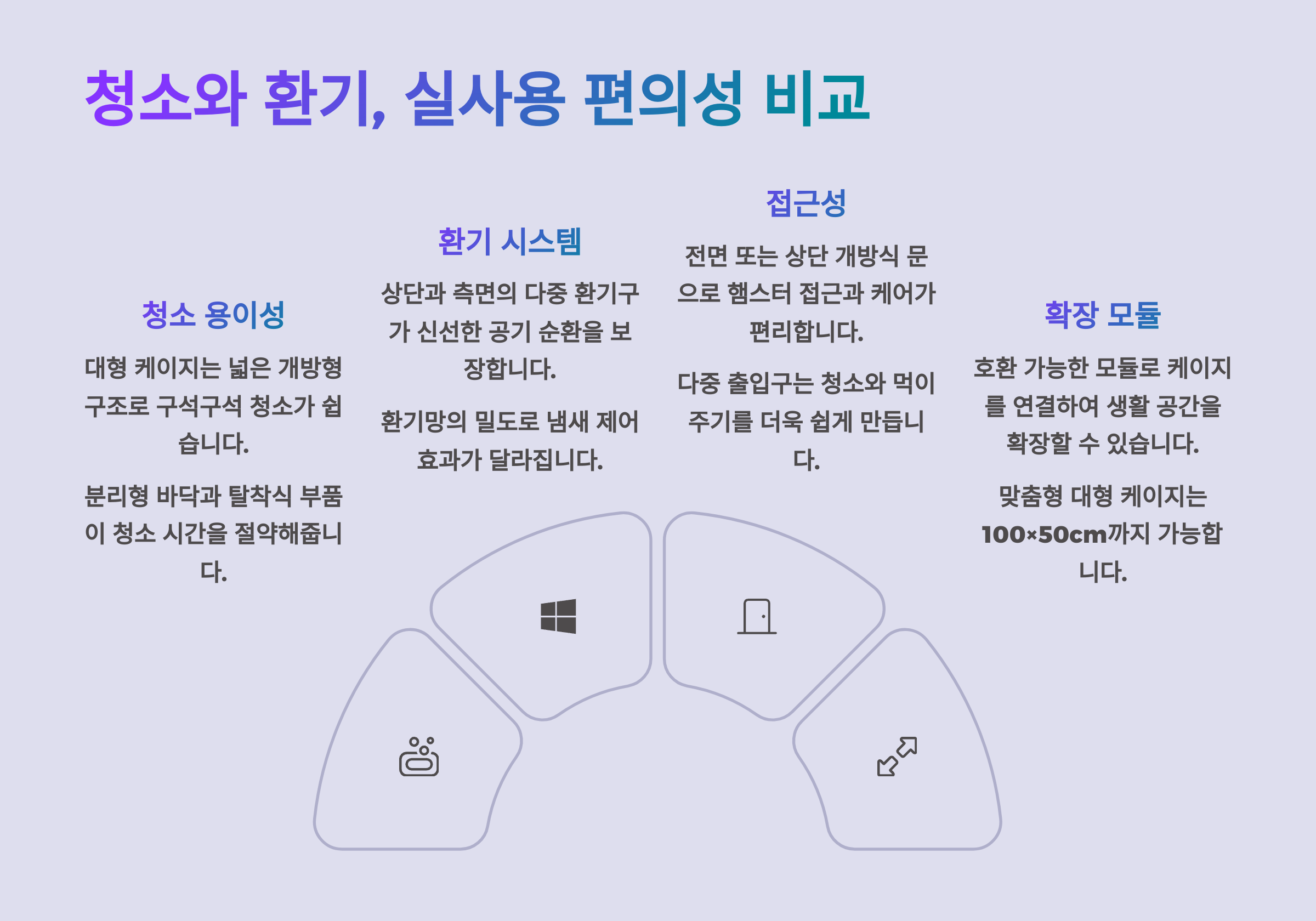 케이지를 선택할 때 넓이와 구조만큼 중요한 게 바로 '관리 편의성'이에요. 햄스터는 소변을 한 곳에 보지 않고 여러 구석에 흩뿌리는 습성이 있기 때문에 청소하기 어렵고 환기가 안 되면 쾌적한 환경을 유지하기 힘들어요. ❌🦠