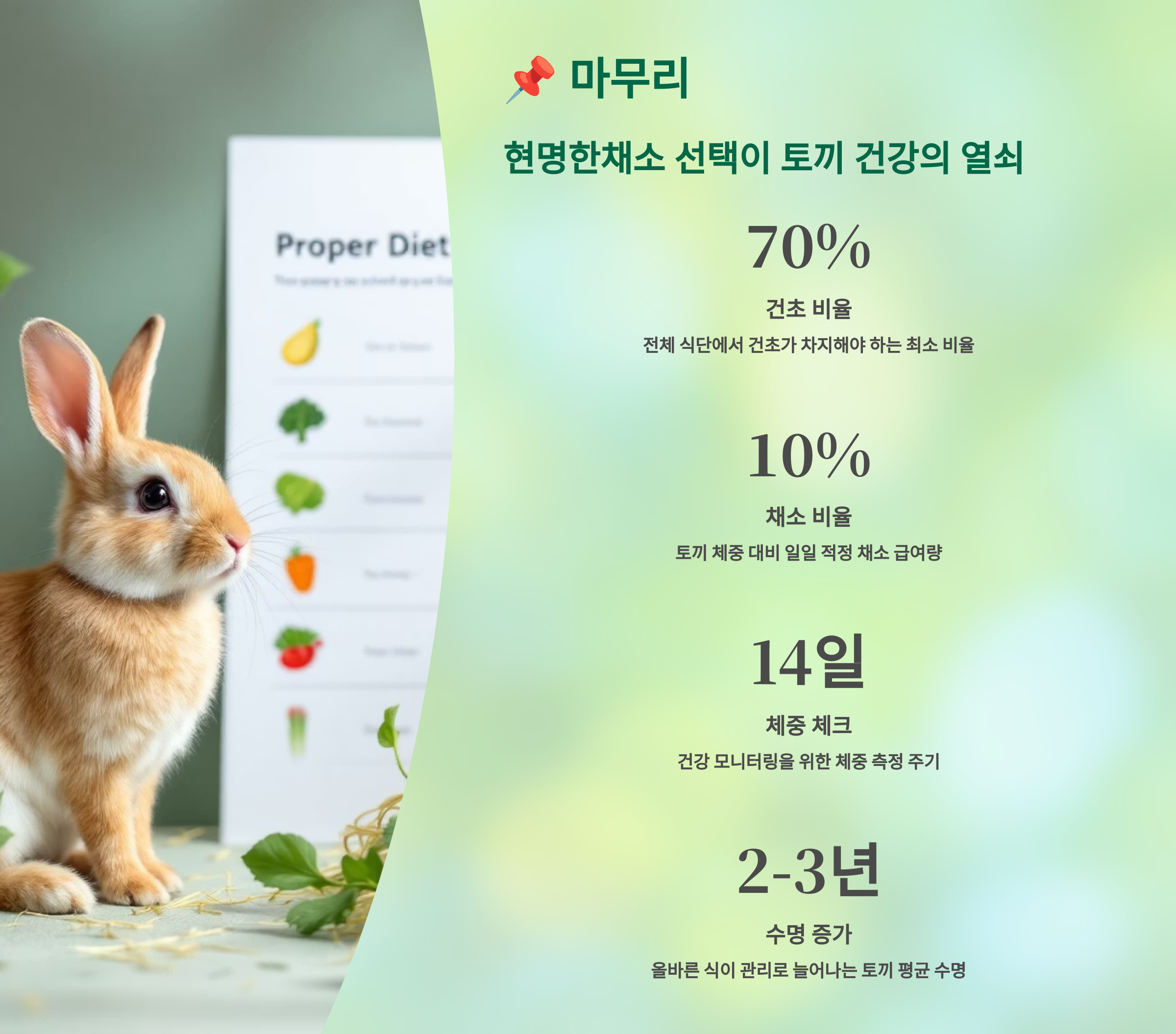 👩⚕️ 실제로 많은 수의사들도 토끼에게 채소를 급여할 때, 건초 80% + 안전 채소 15% + 기타 간식 5%의 비율을 권장해요. 채소는 보조적인 급여 식품이라는 인식을 가지는 게 좋고, 주식은 항상 건초가 되어야 건강한 장을 유지할 수 있답니다!