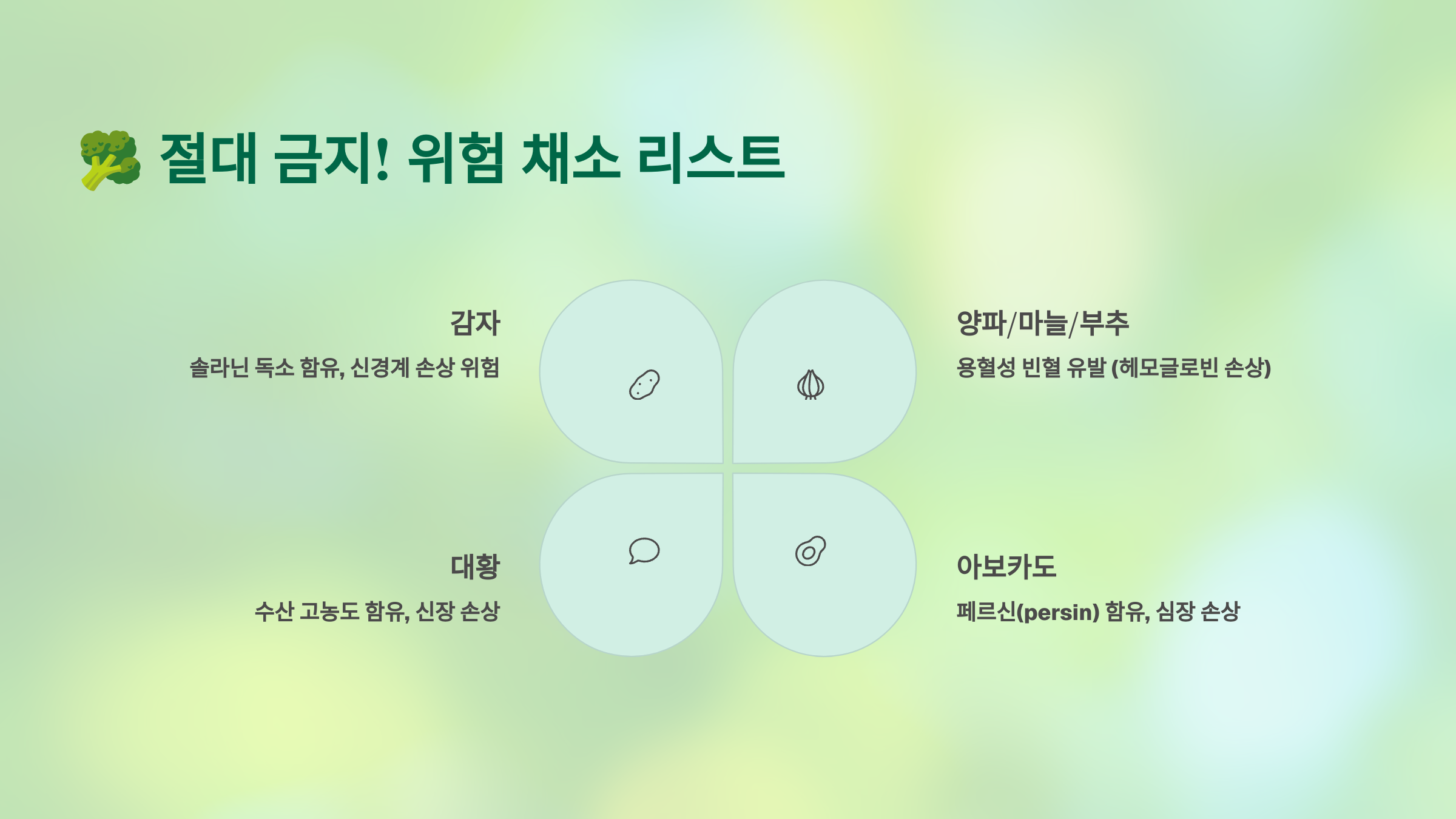 | 채소 이름 | 위험 성분 | 주요 증상 | 급여 위험도 |