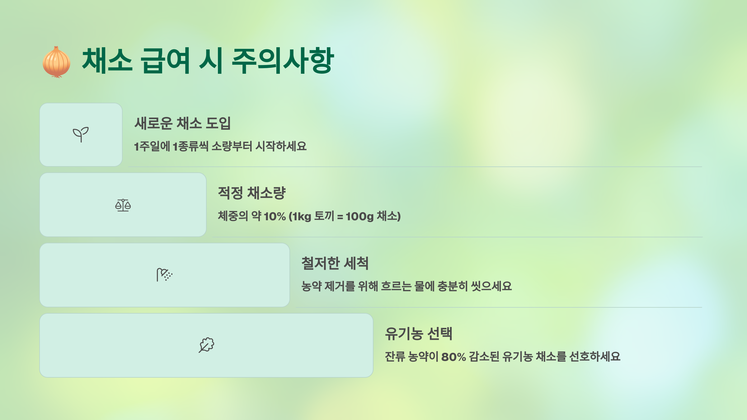 💡 채소 급여 시 주의할 점은 반드시 소량부터 시작해서 반응을 관찰하는 거예요.