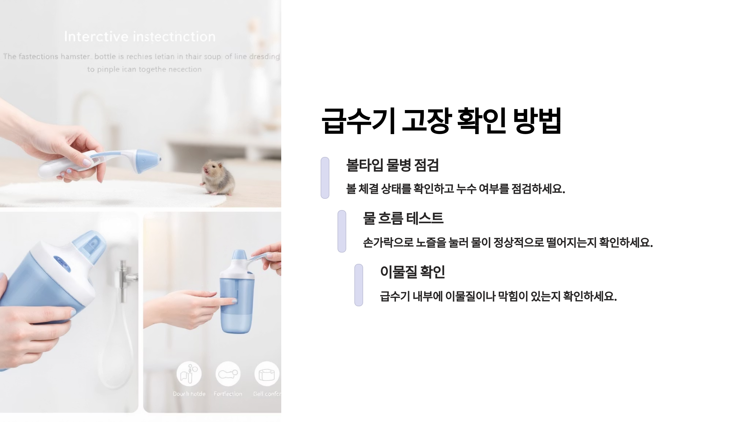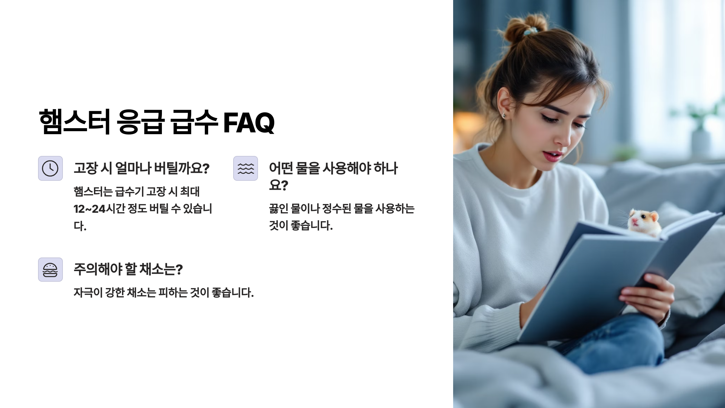 📌 급수기 하나가 멈춰도, 보호자의 대응력은 멈추지 않아야 해요. 다양한 대체 수단을 익혀두고, 평소 햄스터가 익숙해지도록 트레이닝하는 것도 좋은 방법이랍니다!