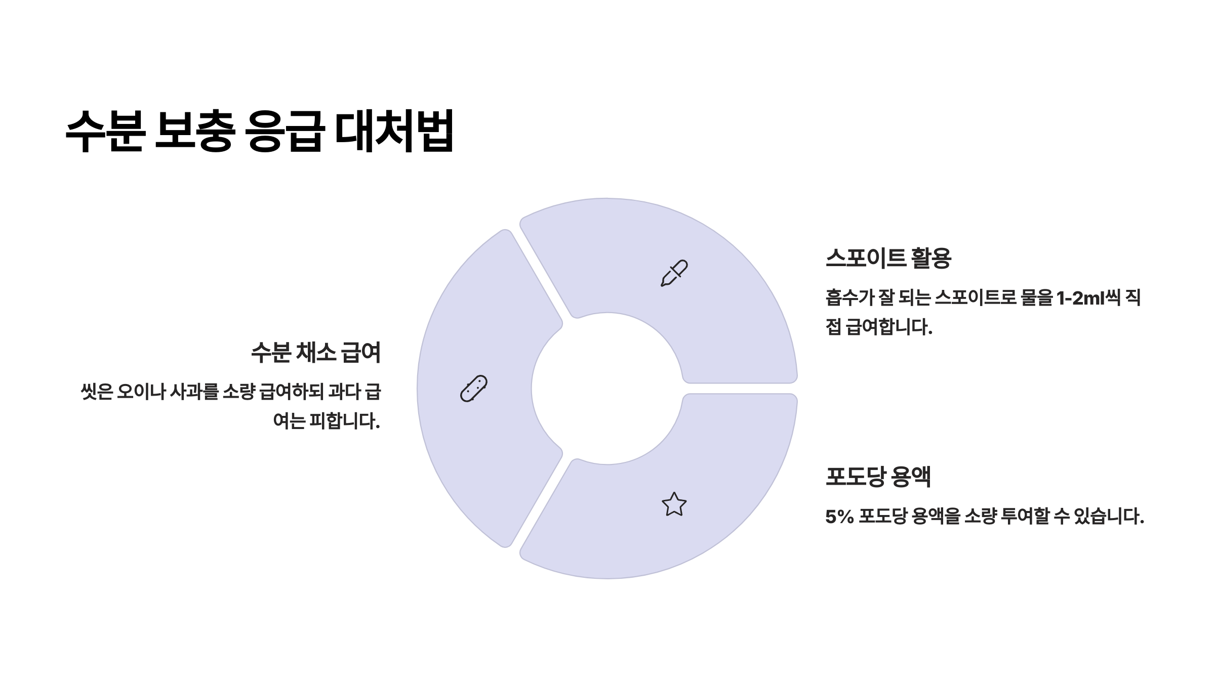 🧃 오이, 수박, 사과 같은 수분 많은 과일을 갈아서 즙을 내고 스포이드로 급여해도 좋아요. 단, 과일은 당이 많기 때문에 너무 자주 주면 오히려 탈수 증상을 악화시킬 수 있으니 1~2회 한정으로 사용해 주세요.